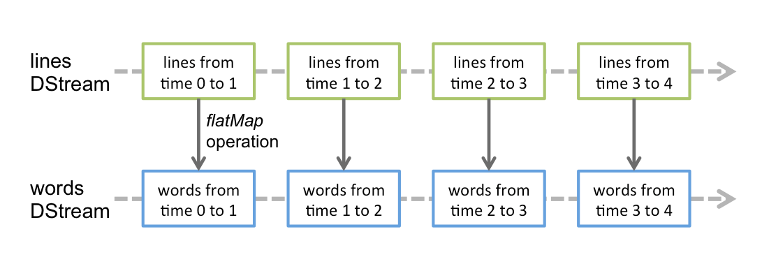 在这个简单的示例中,行是一个输入DStream,因为它表示从netcat服务器接收到的数据流。